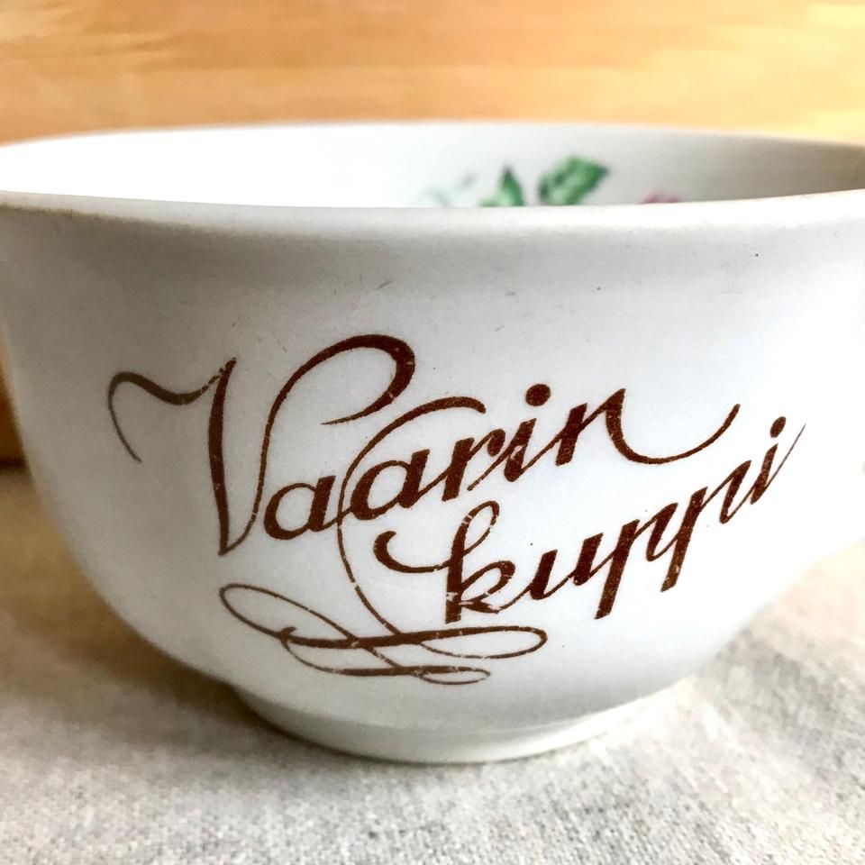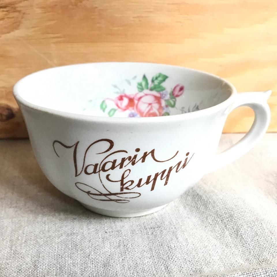 訳ありWEB限定価格! フィンランドのARABIA社のヴィンテージ カップです。 たっぷりサイズのカップです。 フィンランド語で「vaarin kuppi」と書いてあります。 クラシカルなバラが描かれています。 目立つダメージはございませんが、底に経年による汚れ、細かいキズがあります。