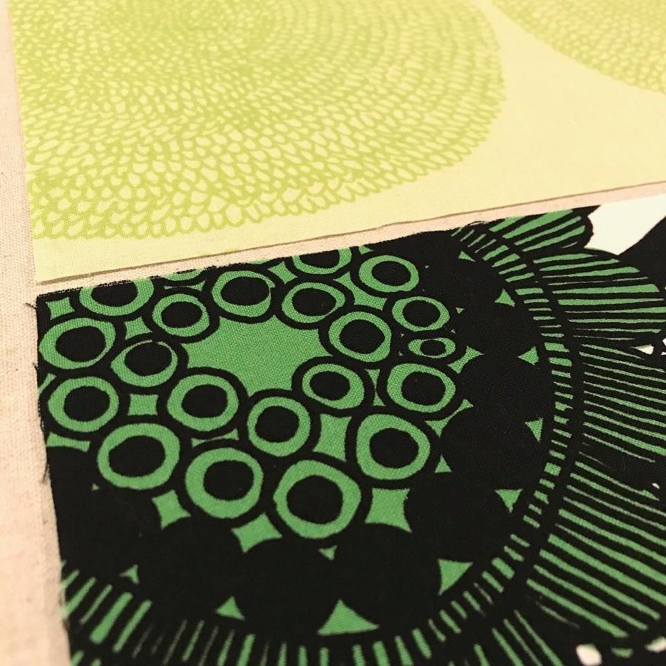 50×50cmの枠の中にハギレを並べています。