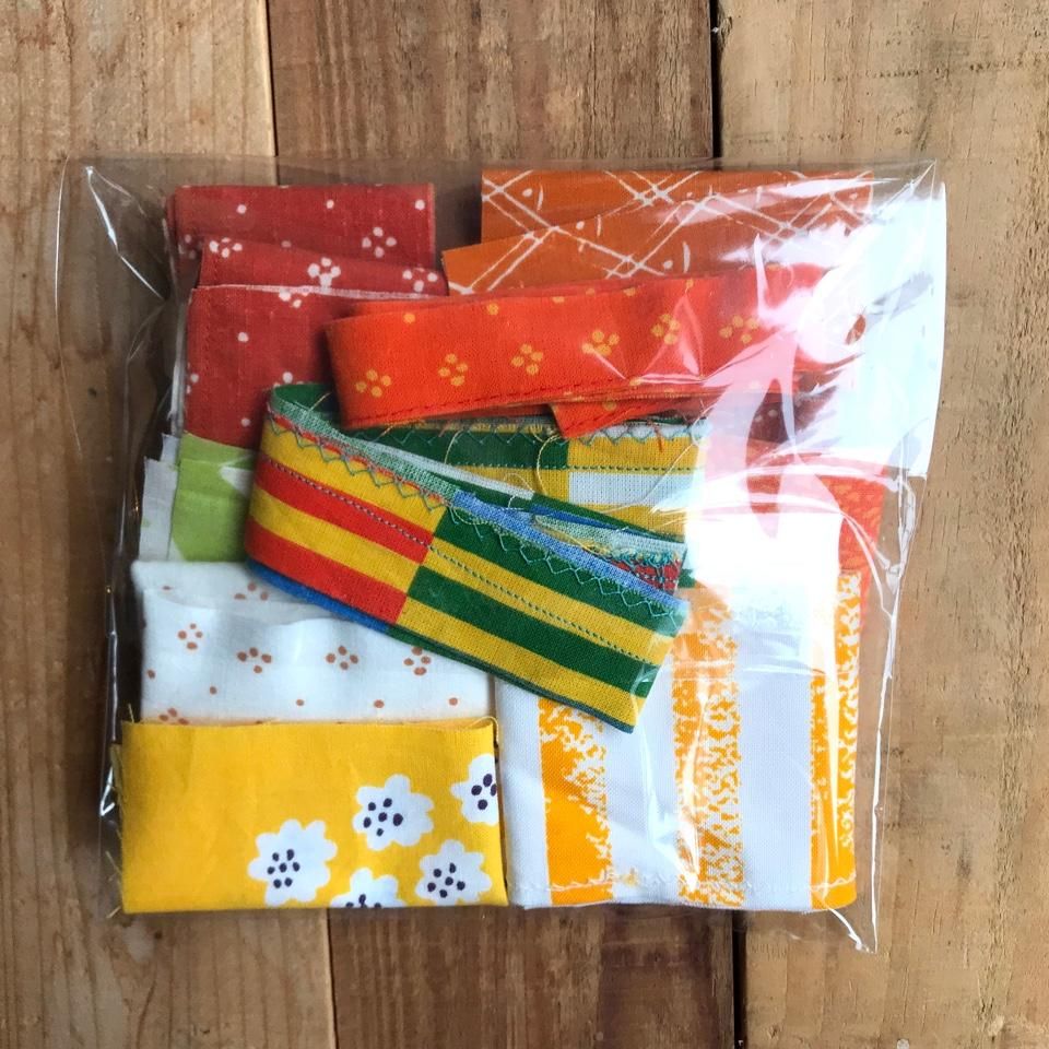 カットが真っ直ぐではないもの、柄が途切れているもの、縫い目があるヒモ状のもの、パイピング部分があるもの、色褪せやダメージなどの訳ありのハギレです。